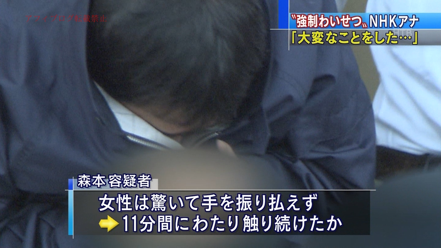電車内で女性の胸を触ったとして、警視庁玉川署に強制わいせつの現行犯で逮捕されたNHK専任アナウンサー、森本健成(たけしげ)容疑者(47)。NHKは16日の「おはよう日本」午前7時台の放送冒頭で、阿部渉アナ(45)が視聴者に謝罪した。